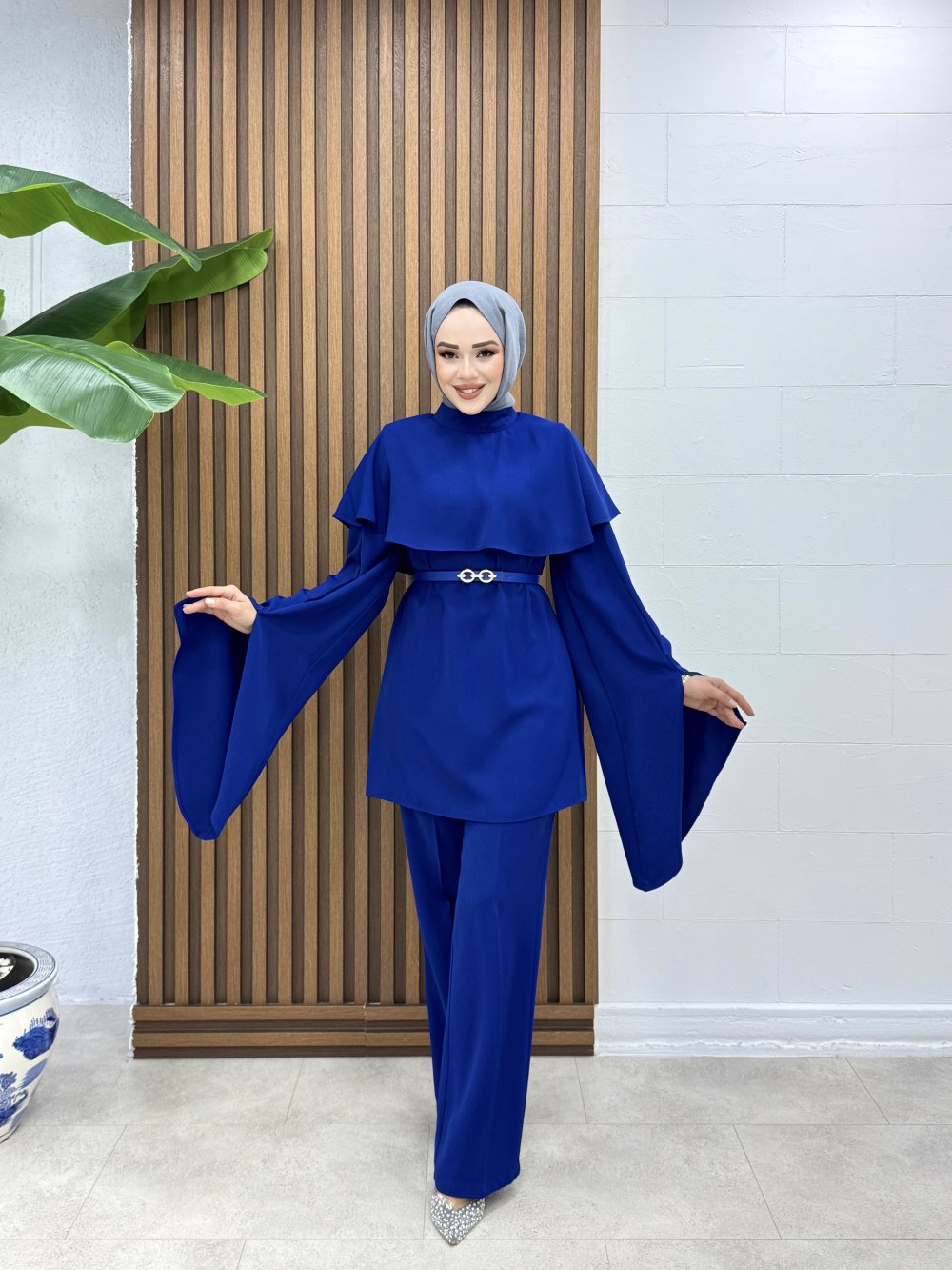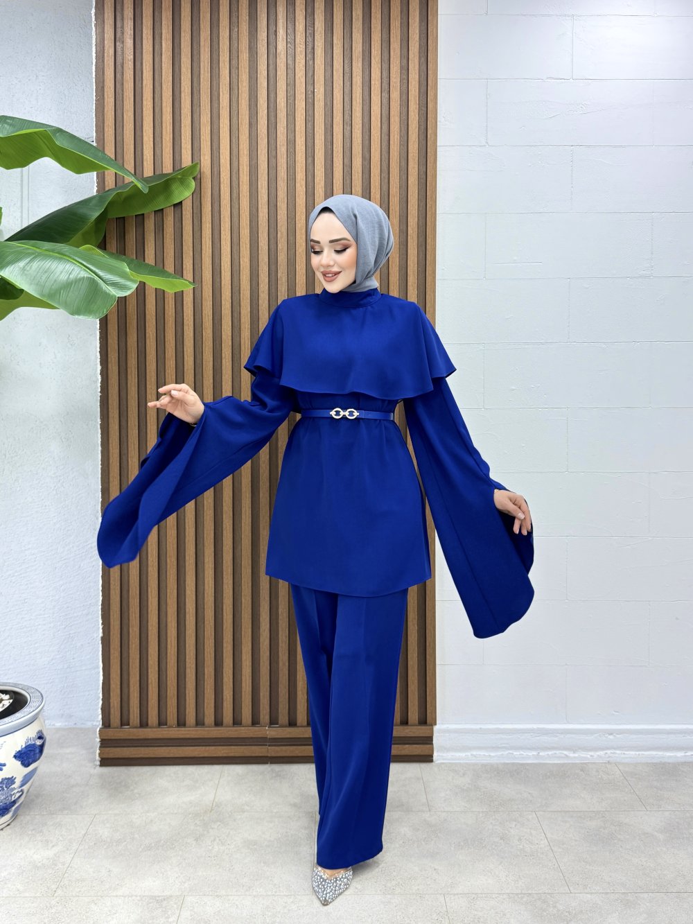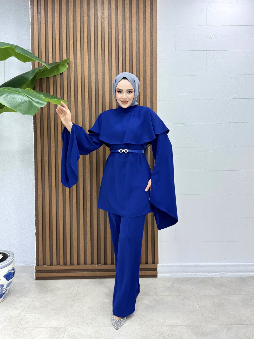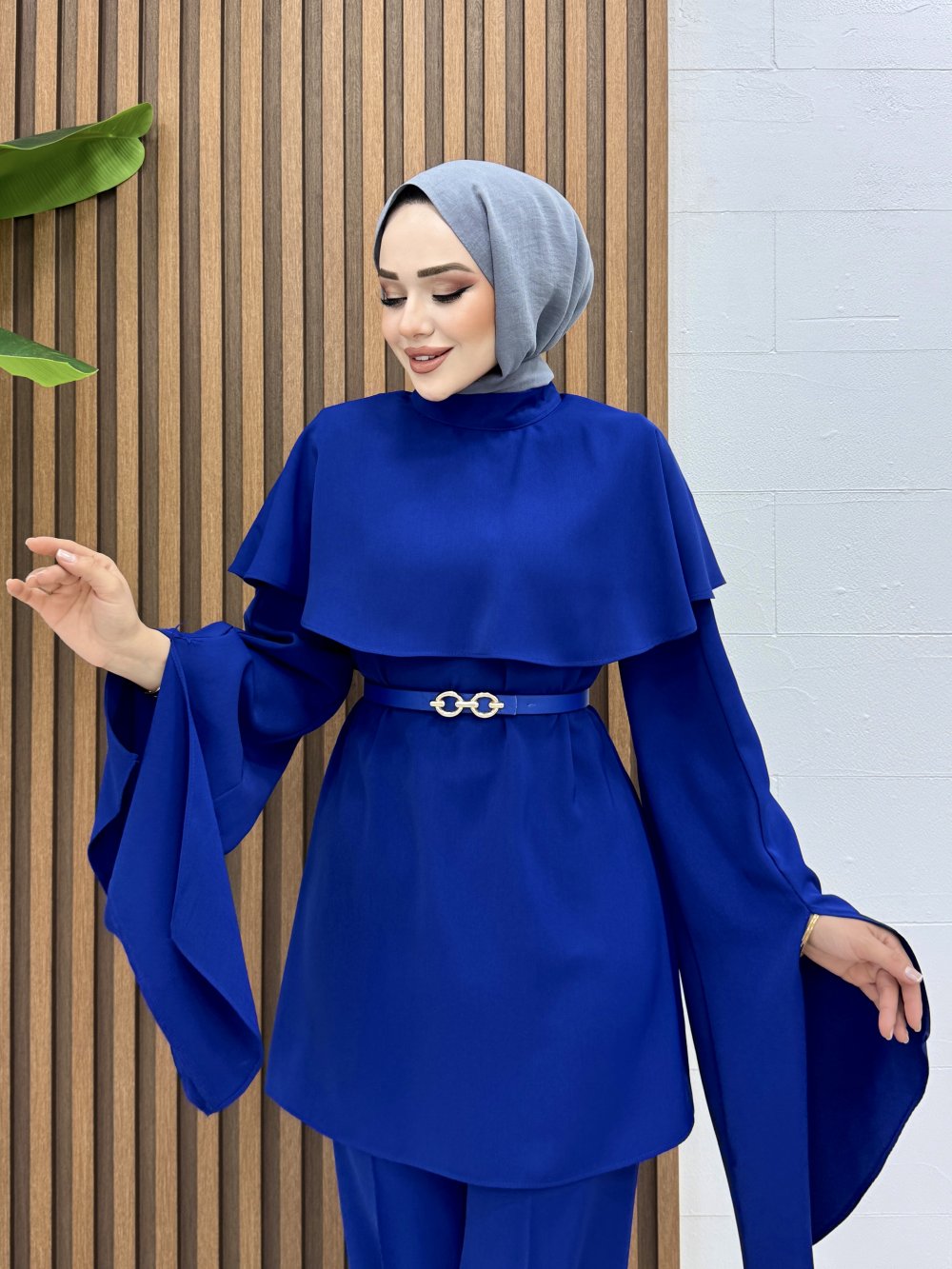 Takım 1 Sınıf Linda Krep Kumaştır.Tunik Üst Pelerin Detaylıdır.Tunik Arkadan Fermuarlıdır.Tunik Kolları Yırtmaçlıdır.Takımda Gold Tokalı Kemer Mevcuttur.Tunik Boy 85cm Omuz 38cm Göğüs 94cm Pantolon Boy 110cm Basen 94cm